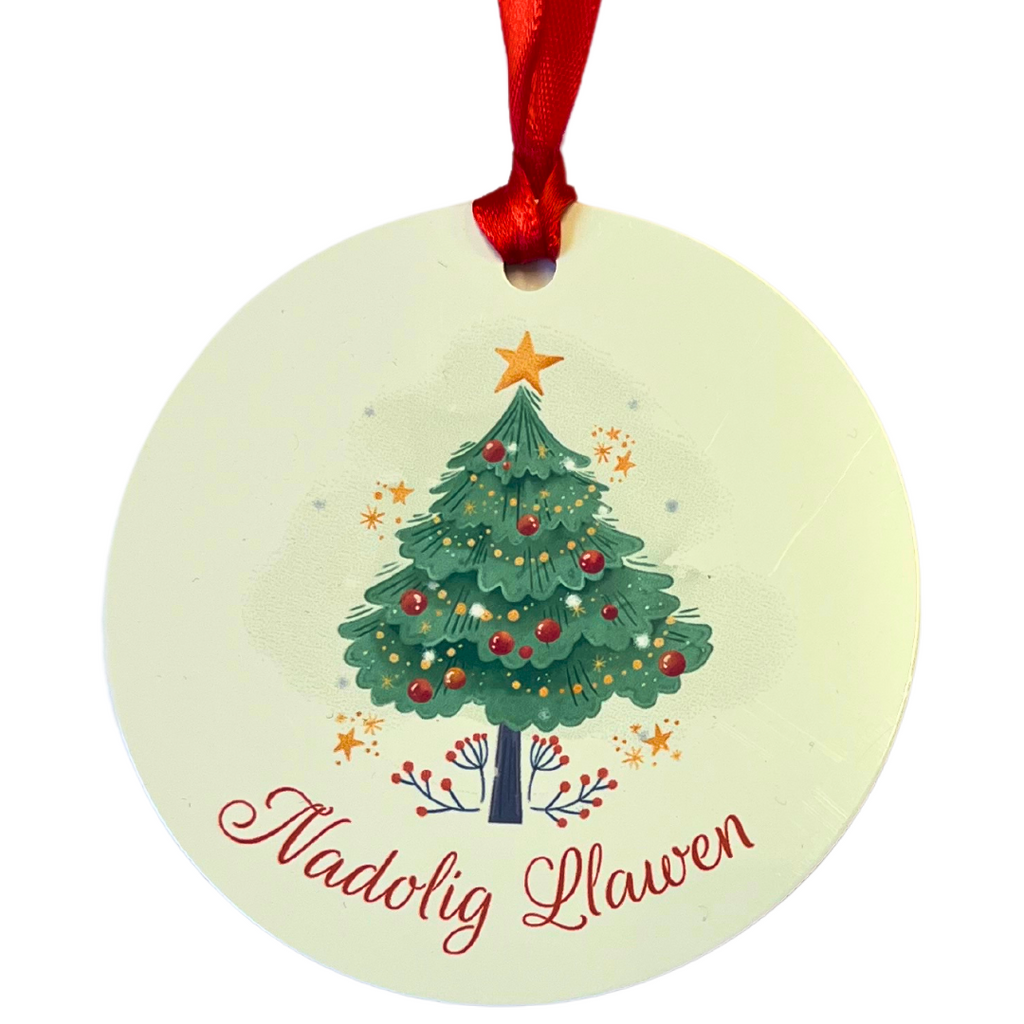 Addurn metel gyda llun o Goeden Nadolig a Nadolig Llawen.