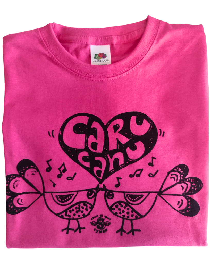 100% Cotton t-shirt with Caru Canu, love to sing in Welsh, and two birds singing screenprint.