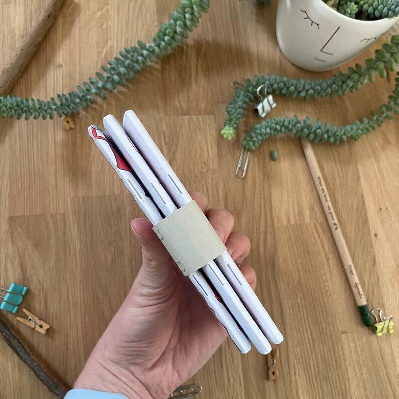 - Printed to order: with vegetable based inks. Finished with silver staples & recycled belly band, also from 100% recycled paper.